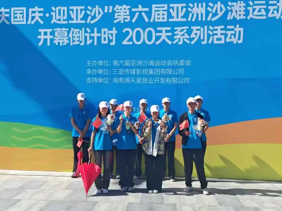10月4日早上,国旅学院组织了几名志愿者,参加了“庆国庆 迎亚沙”第六届亚洲沙滩运动会倒计时200天健走活动。在三亚湾细腻的沙滩上,志愿者们完成了2公里健走打卡,并且领取了可爱的“亚亚”玩偶。